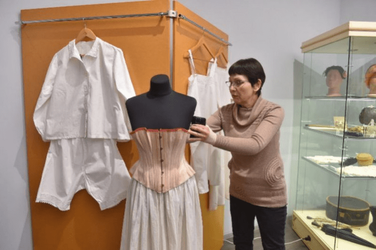 Ольга Чайка, старший научный сотрудник музея, рассказывает об одном из уникальных экспонатов – корсете конца XIX века. Тогда от женщин требовали строгих стандартов красоты, и они вынуждены были носить корсеты, значительно ограничившие движения. Чтобы достичь желаемой тонкой талии, использовалась  жесткая ткань, на которую пришивали узкие полоски и вставляли китовый ус, а шнуровка еще больше стягивала фигуру.